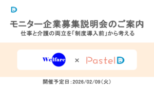 いつもPastel Dをご利用いただきありがとうございます。このたび、ウェルフェア株式会社をはじめとする未来共創研究カンパニーにて、仕事と介護の両立支援サービスのモニター企業様募集説明会の実施が決定いたしました。 働き方 […]