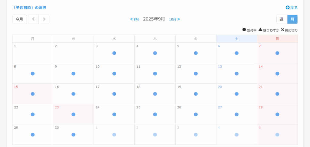 カレンダーからご希望の日時を選択し、初回アンケートにご記入の上、ご予約ください。