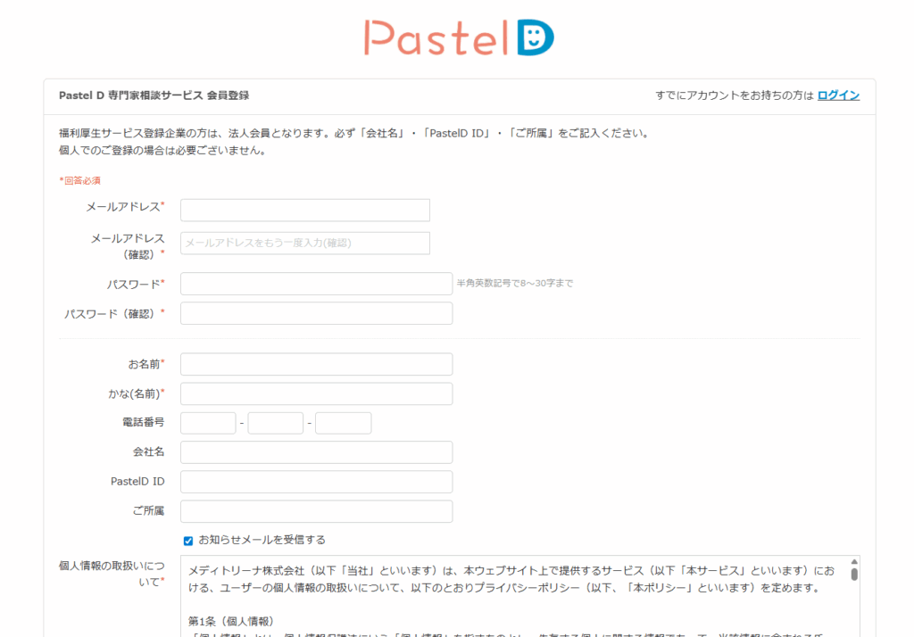 ※「会社名」「PastelD ID」「ご所属」を必ずご入力ください。「PastelD ID」が分からない場合は各企業の担当部署にお問い合わせください。