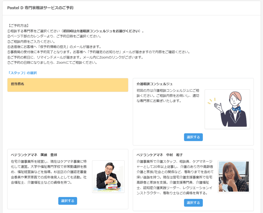 ご予約希望の専門家を選び、「選択する」ボタンをクリックすると、予約カレンダーが表示されます。